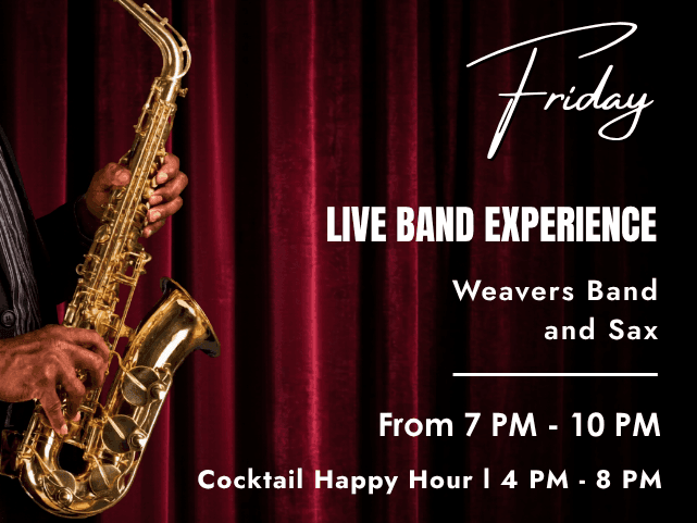Enjoy your weekend! Every Friday, experience an amazing night with the Weavers Band and get special discounts on cocktails.